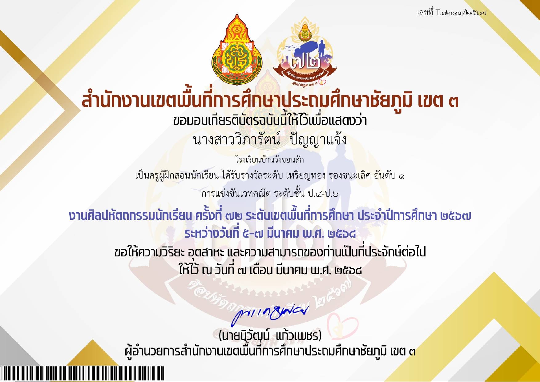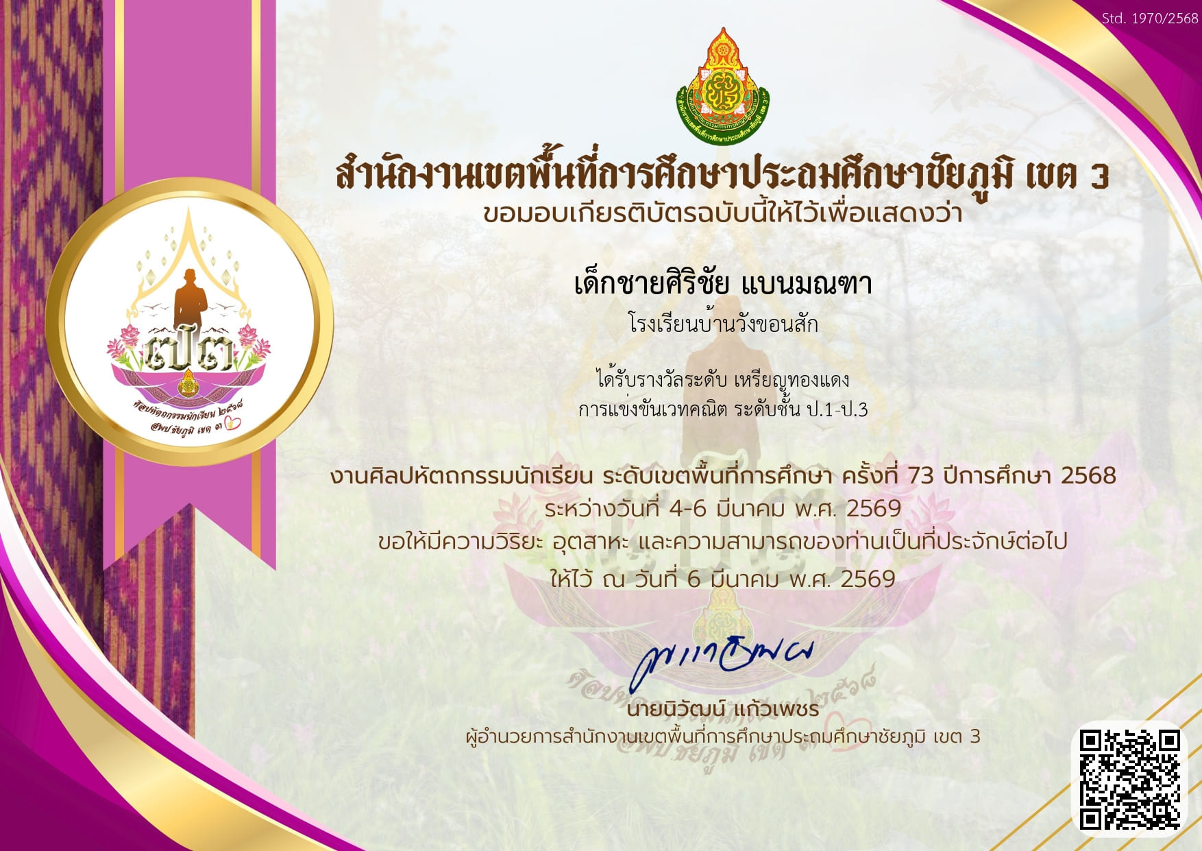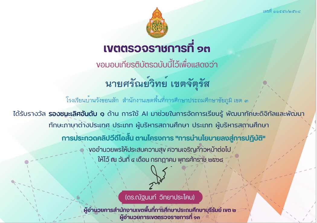 รางวัลรองชนะเลิศอันดับ 1 ด้านการใช้ AI มาช่วยในการจัดการเรียนรู้ ประเภทผู้บริหารสถานศึกษา การประกวดคลิปวีดีโอสั้น ตามโครงการ "การนำนโยบายลงสู่การปฏิบัติ" |